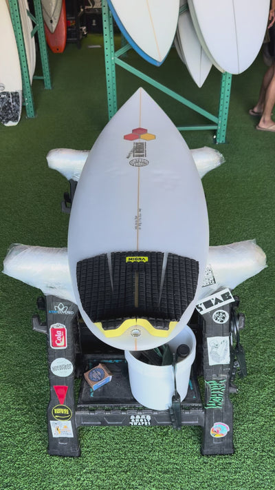 This board is in used condition — check the video for a detailed look. Ideal for intermediate to advanced surfers seeking a responsive, competition-level shortboard with pro-inspired design and craftsmanship.