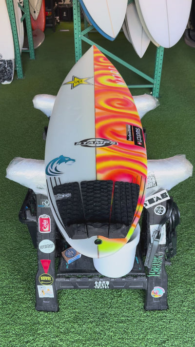 This board is in used condition — check the video for a complete look at its shape and features. Perfect for surfers seeking a performance step-up shortboard for larger surf and high-speed turns.